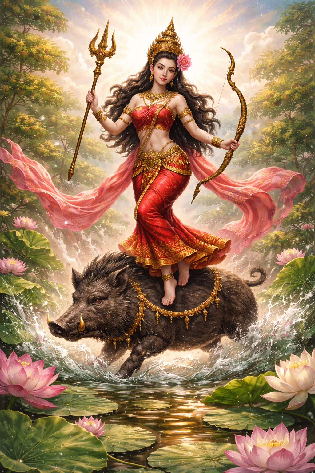 🌸 ทัดดอกไม้ : ดอกบัวหลวง 💎 เครื่องประดับ : แก้วโมรา 👗 เครื่องทรง : พาหุรัด 🐗 พาหนะ : วราหะ (หมูป่า) ⚔️ อาวุธ : มือขวา : ตรีศูล มือซ้าย : ธนู🧍♀️ อิริยาบถ : ยืนบนหลังวราหะ